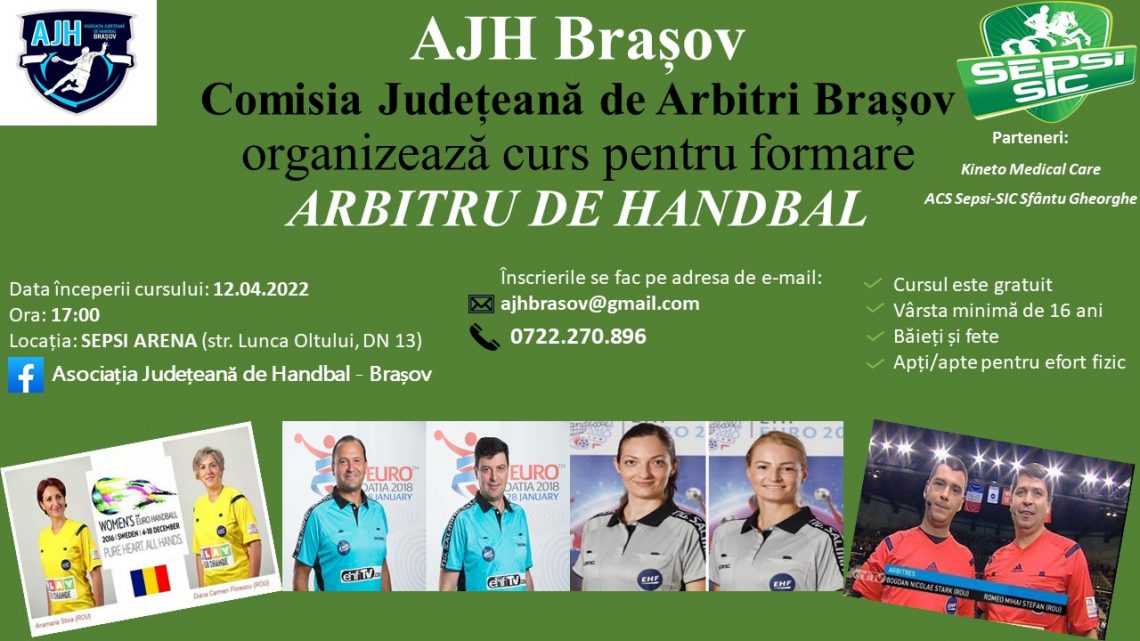 Asociația Județeană de Handbal Brașov, prin Comisia Județeană de Arbitri Brașov, în parteneriat cu ACS Sepsi-SIC Sfântu Gheorghe și Kineto Medical Care, organizează un curs pentru formarea arbitri de handbal. Pentru a atrage cât mai mulți tineri, lectorii cursului vor fi arbitri din lotul divizionar, arbitri internaționali, observatori naționali și internaționali.