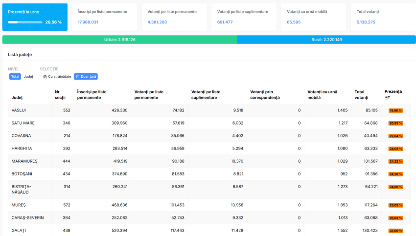 Conform datelor oficiale privind prezenţa la vot, până la ora 15 în ţară votaseră 5.138.275 de persoane, la care se adaugă aproape 700.000 de voturi exprimate în străinătate. În total, prezența la vot a depăşit 32%.