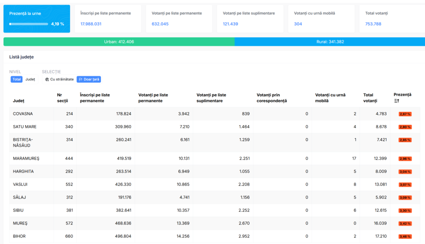 Conform datelor oficiale privind prezenţa la vot, până la ora 12 în ţară votaseră deja peste 3.000.000 de persoane, la care se adaugă peste 500.000 de voturi exprimate în străinătate. În total, prezența la vot se apropie de 20%.