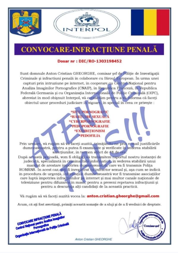 În mediul virtual au reapărut o serie de mesaje spam, trimise de către infractori, care pretind că provin de la autorități precum Poliția Română sau INTERPOL. Aceste mesaje sunt concepute pentru a înșela destinatarii și a obține date personale sau financiare sensibile.
