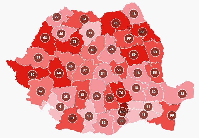 În urma testelor efectuate la nivel național, față de ultima raportare, au fost înregistrate 2.158 de cazuri noi de persoane infectate cu SARS – CoV – 2 (COVID – 19), acestea fiind cazuri care nu au mai avut anterior un test pozitiv. Distribuția pe județe a cazurilor per total și a celor noi o regăsiți în tabelul de mai jos.
