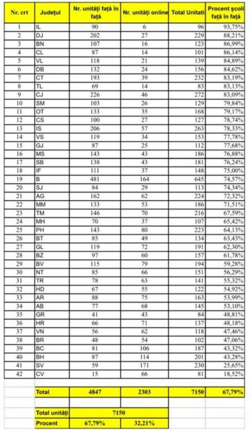 Astfel, s-au deschis cu prezență fizică 4.847 de unități de învățământ din România, în timp ce 2.303 fac cursuri online.