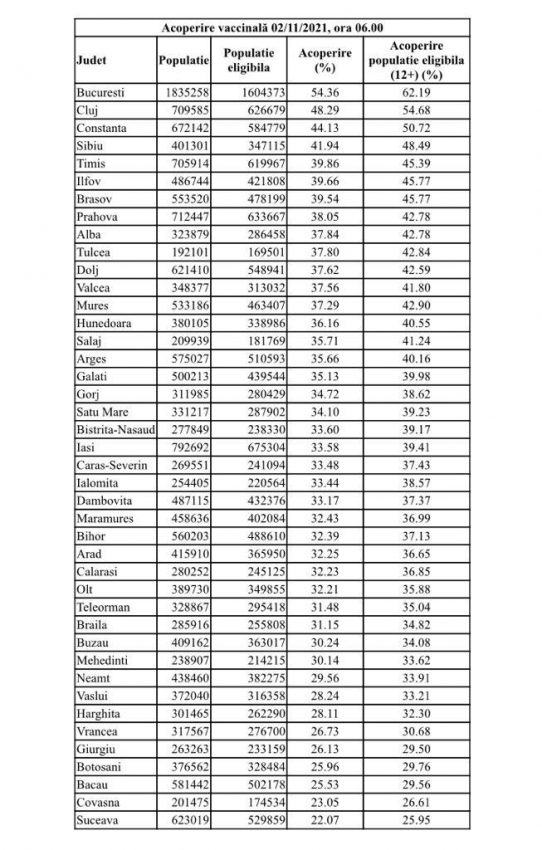Cea mai mare rată de vaccinare anti-COVID – peste 62% din populaţia eligibilă, de peste 12 ani – este în București, urmat de judeţele Cluj – 55% şi Constanţa – 50%. Cel mai mic procent de vaccinare – sub 26% – este în Suceava, primul “județ roșu” al României, la debutul pandemiei, urmat de Covasna și Bacău, unde s-a vaccinat mai puțin de 30% din populația eligibilă.
