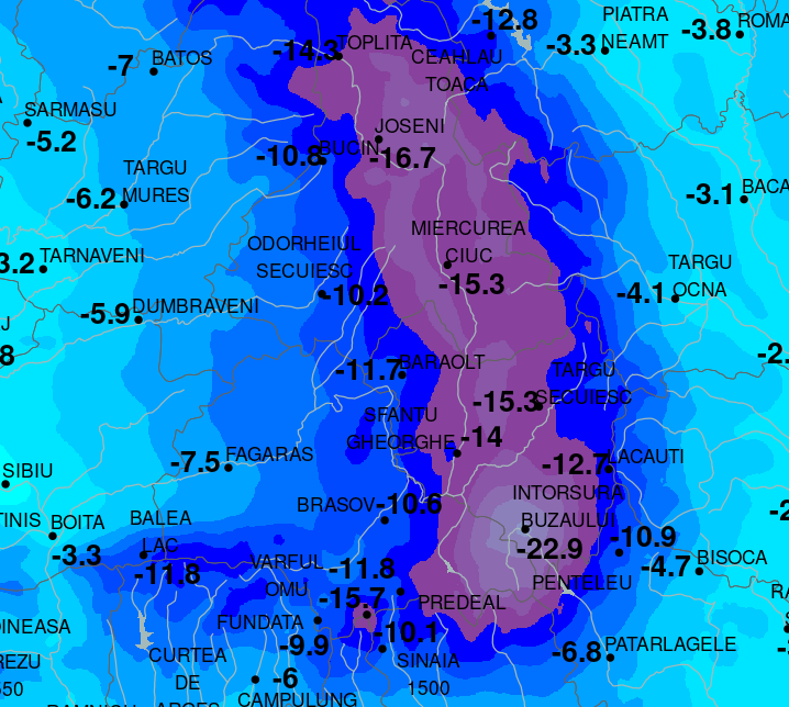Ger a fost și la Joseni, în județul Harghita, acolo unde s-au înregistrat minus 16,7 grade Celsius, iar la Predeal minima a coborât până la minus 15,7 grade, cea mai scăzută valoare din județul Brașov. Foarte frig a mai fost și la Miercurea Ciuc, dar și la Târgu Secuiesc, acolo unde s-au înregistrat minus 15,3 grade Celsius, iar la Sfântu Gheorghe au fost minus 14 grade.