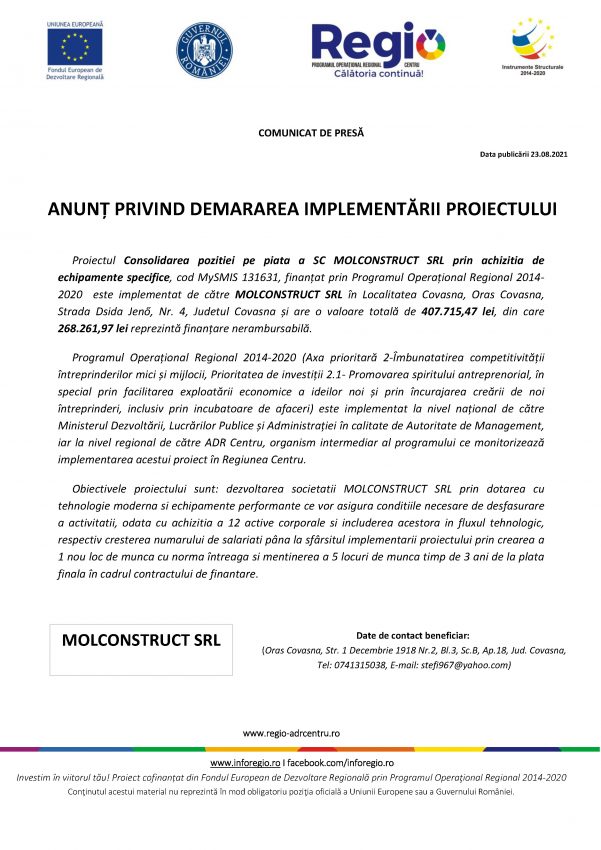 Locale MOLCONSTRUCT SRL: Anunț privind demararea implementării proiectului By We Radio 23.08.2021 Distribuie, să afle şi alţiiPublicitatePublicitate Publicitate Alte ştiri Locale Primarul Antal Árpád: „Cât timp sunt primar o să ţin impozitele pe locuinţe la nivelul minim permis de lege” 14.01.2026 Locale Conducerea TEGA explică procesul de colectare selectivă și demontează mitul amestecării deșeurilor 14.01.2026 Locale Patru stații de încărcare rapidă pentru autobuzele electrice au fost puse în funcțiune la capătul de linie din cartierul Simeria 14.01.2026