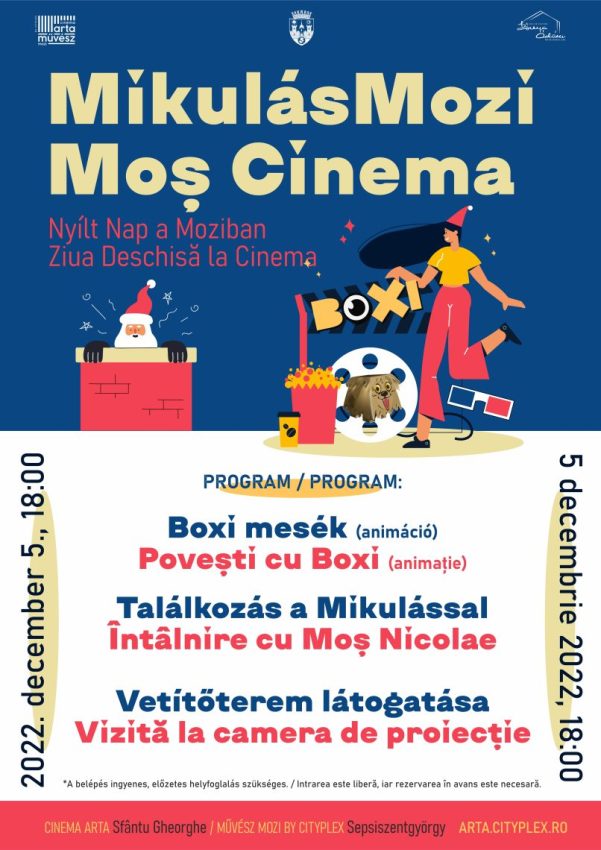 Casa de Cultură „Kónya Ádám” și Cinema Arta by Cityplex organizează în data de 5 decembrie 2022, luni, Ziua Deschisă la Cinema cu titlul Moș Cinema.