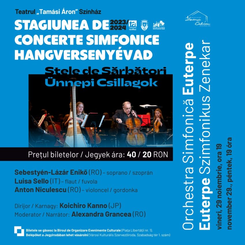 „Numele Orchestrei Simfonice Euterpe din Brașov este, cu siguranță, familiar publicului din Sfântu Gheorghe (…) La concert vor participa ca soliști Sebestyén-Lázár Enikő (soprană), Luisa Sello (flaut) și Anton Niculescu (violoncel), iar dirijor va fi Koichiro Kanno. Evenimentul va fi narat de Alexandra Grancea. Biletele, cu prețuri de 40 și 20 lei, pot fi achiziționate de la Casa Municipală de Bilete (Piața Libertății, nr. 1)”, transmit reprezentanții Casei de Cultură „Kónya Ádám” din Sfântu Gheorghe.
