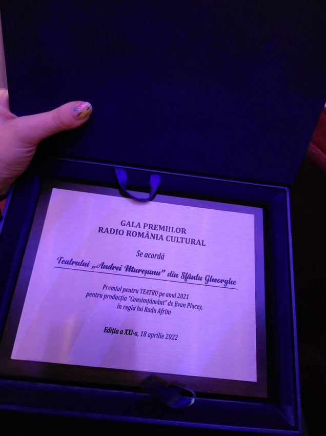 Gala Premiilor Radio România Cultural a acordat Teatrului „Andrei Mureșanu” din Sfântu Gheorghe premiul pentru teatru pe anul 2021 pentru producția „Consimțământ” de Evan Placey, în regia Radu Afrim.